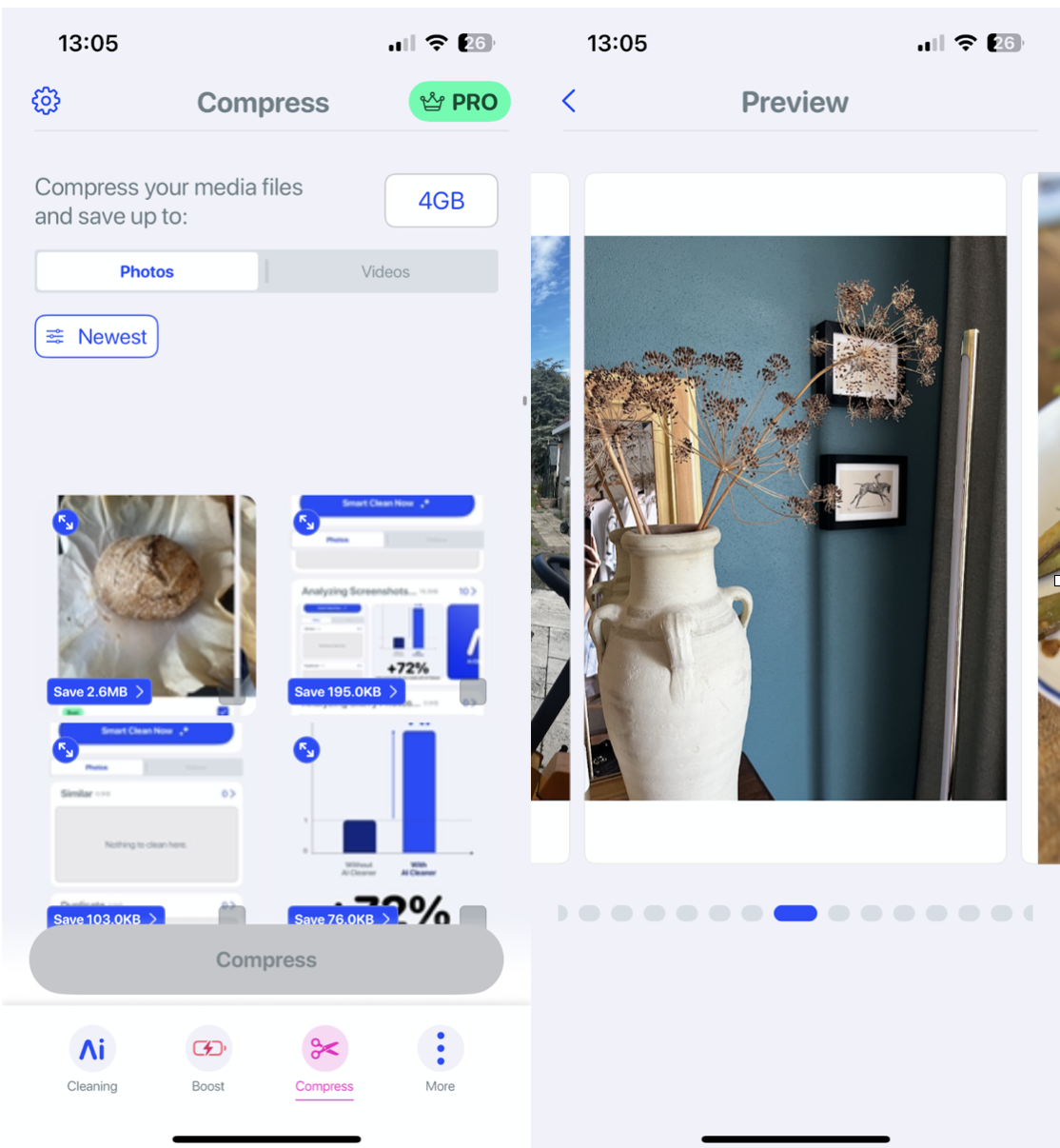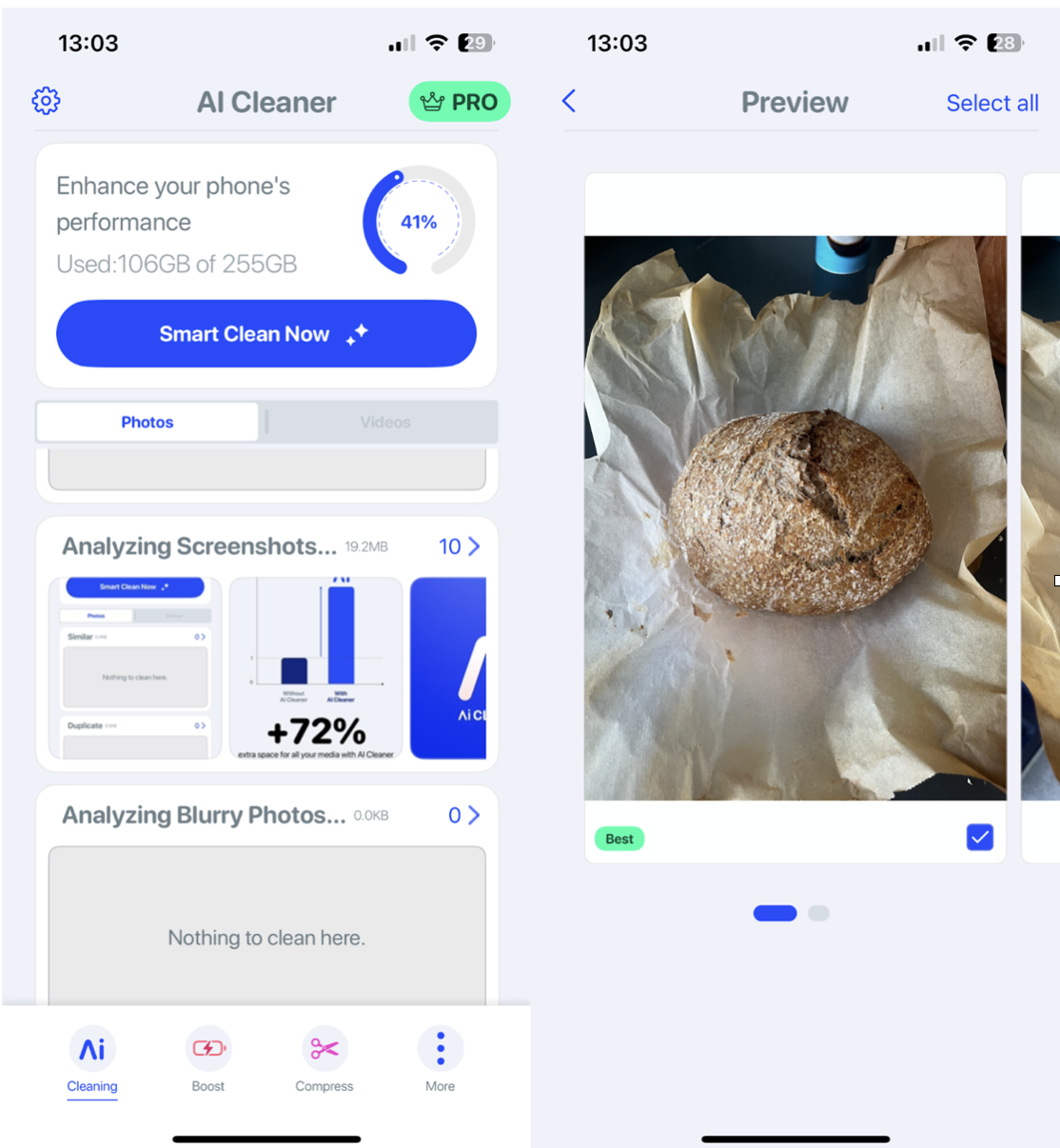 When you first launch the app, you're presented with three core tools (along the bottom) AI Cleaning, Boost, and Compress. With a visually appealing layout, the apps feel intuitive and simple to use. It's clear that the goal is to help users free up space with minimal steps.