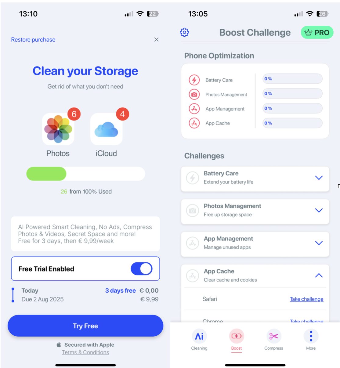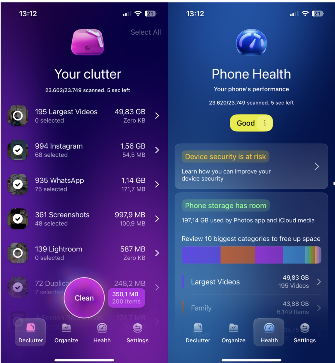 Both apps are designed to help free up space, but they approach it differently. AI Cleaner keeps things fast and simple with one-tap scans and automatic suggestions, mostly focused on photos and videos. It’s a good fit for quick cleanups with minimal input.