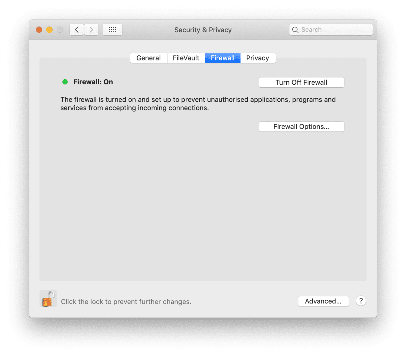 One of the most important tools in your online security arsenal is a firewall. Firewalls block incoming and outgoing network connections and can often be configured to be as strict or as relaxed as you like. You can also usually configure a firewall to prevent your Mac from being “pinged” – where a piece of data is sent to it over the network to check if it’s “there.”