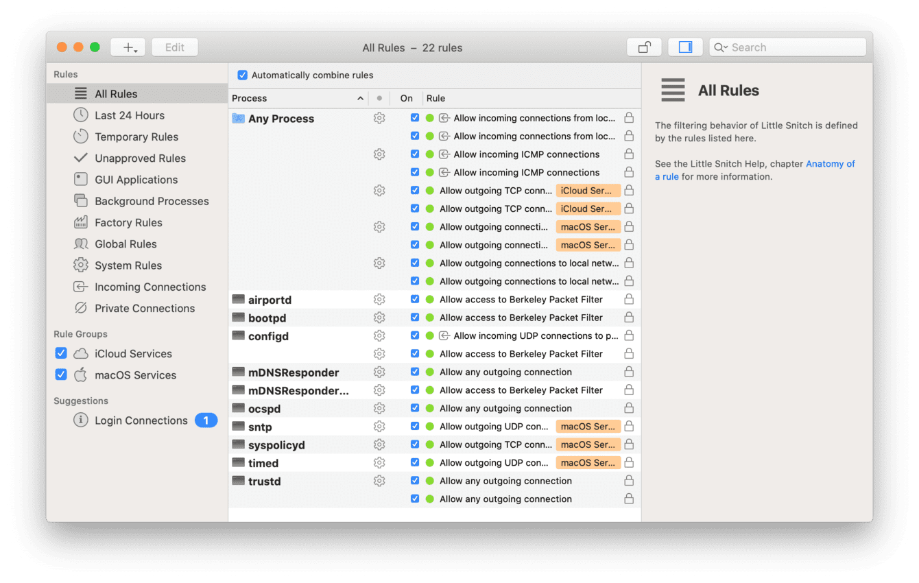 Murus allows you to drag and drop elements to create sets of rules from pre-created presets. Or, you can re-write your own rules from scratch. If what you want is to fine-tune the built-in macOS firewall, Murus could be the ideal tool.