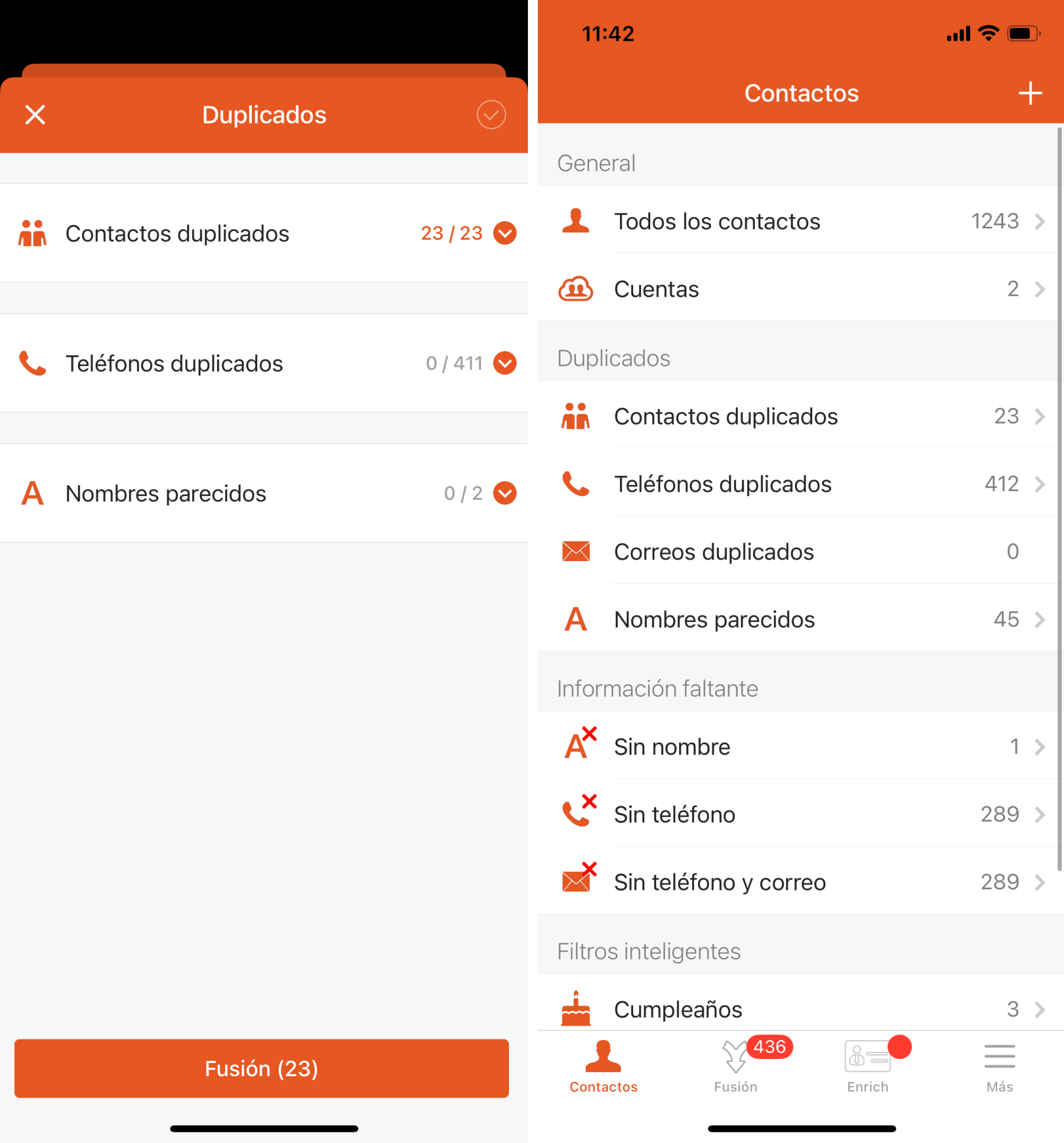 Tienes la opción de combinar o eliminar duplicados y de completar la información que falte en tus contactos.