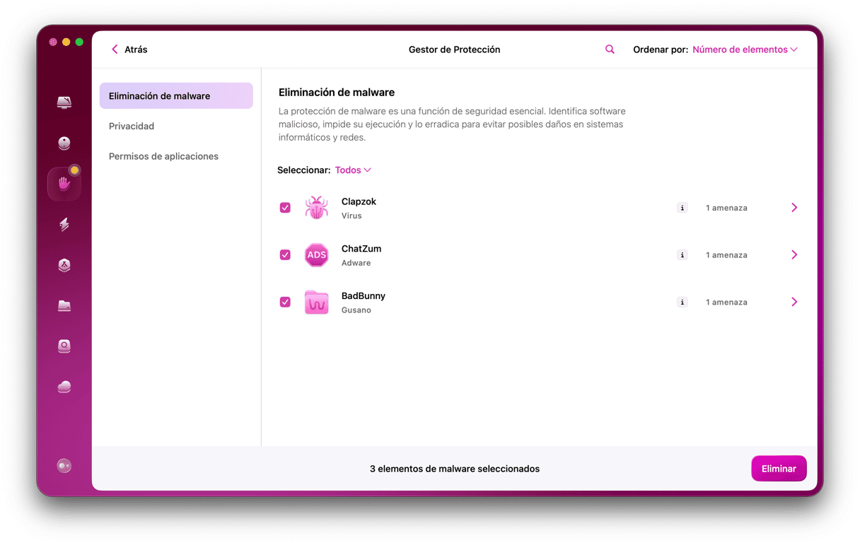 Aunque no es propiamente una herramienta antimalware, CleanMyMac cuenta con un módulo llamado Protección. Haz un clic y CleanMyMac analizará el Mac, comparando todo lo que encuentre con su base de datos de malware conocido. Si encuentra algo, podrás eliminarlo con otro clic o revisar en detalles lo que al app ha encontrado. Además, tienes la opción de configurarlo para que analice el Mac automáticamente en segundo plano y te avise si detecta malware.