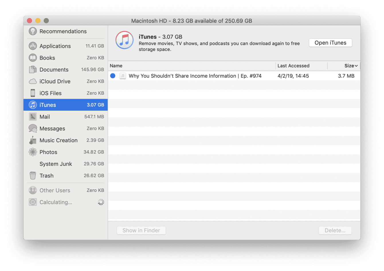 Using the sidebar on the left you will walk through your main storage categories. Pay special attention to such items as iTunes and Documents. They could be supermassive.