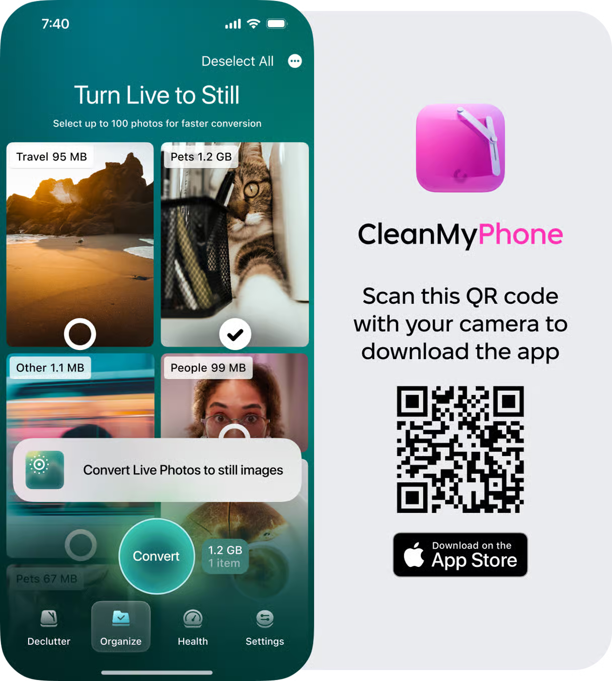 For me, CleanMy®Phone still stands out in my testing. Its Declutter module, for example, gives a more structured way to clean up photo libraries, with batch selection, better previews, and full control over deletions. I also liked their Live to Still feature, which helped trim Live Photos without deleting them entirely. Plus, the built-in Storage overview in Phone Health meant I could actually see what was taking up space and deal with it strategically.