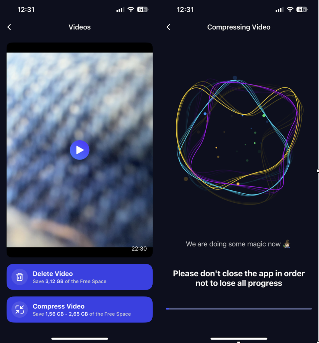 This one surprised me. I had several 4K videos that were hogging space, and Cleaner Guru offered to compress them without losing visible quality. I tested it on a 1.2 GB file and ended up with a version around 300 MB. Playback looked fine on an iPhone screen, though I wouldn't recommend this for footage you plan to edit later.