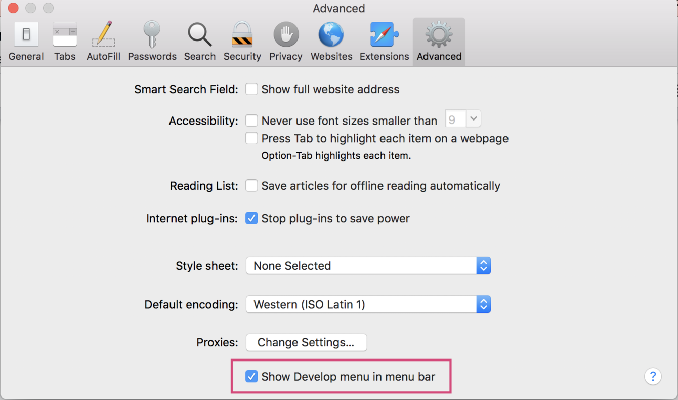 Click the checkbox at the bottom of this tab that reads Show Develop menu in menu bar. A new item will now appear in the menu bar called Develop.