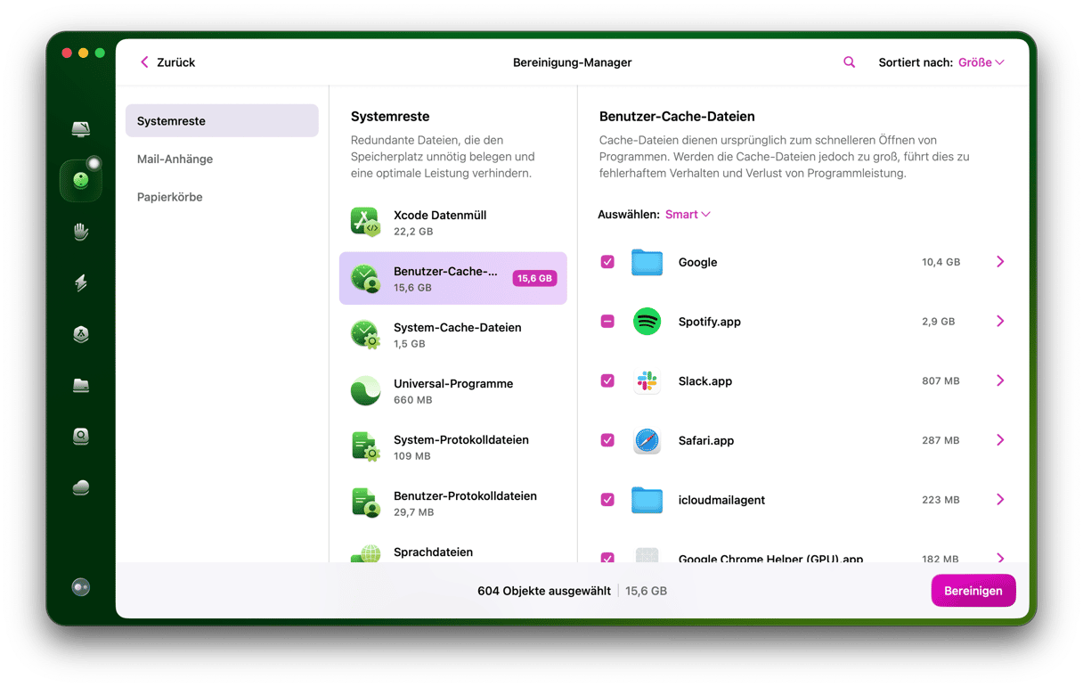 Die App verfügt über ein großartiges Bereinigungs-Feature, mit dem Sie Ihr System von Datenmüll, Cache und defekten Objekten befreien können. So gewinnen Sie nicht nur Speicherplatz zurück, sondern sorgen auch dafür, dass Ihr Mac mit nur wenigen Klicks optimiert wird. So löschen Sie den Mail-Cache automatisch: