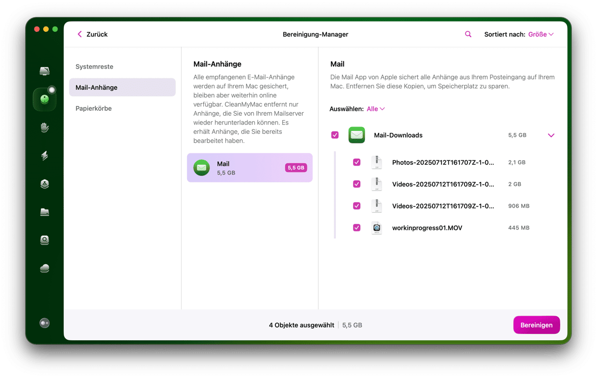 - Wählen Sie „Mail-Anhänge“ und bereinigen Sie die erforderlichen Elemente.