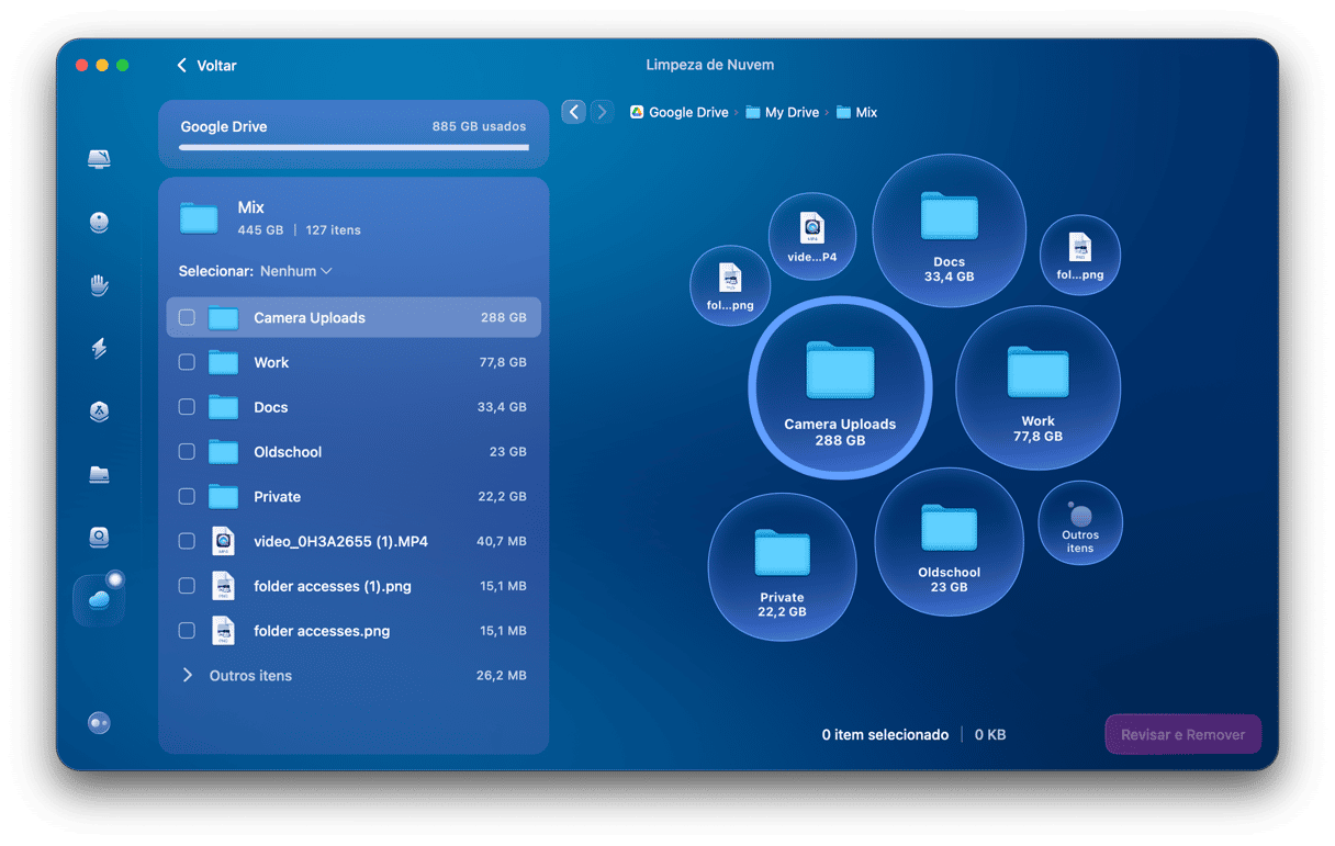 Se você usa o iCloud, Google Drive ou OneDrive, pode mantê-los sem acúmulos, visando sempre ter espaço para arquivos importantes. Para fazer isso com um clique, conecte a conta de nuvem ao recurso Limpeza de Nuvem do CleanMyMac. Depois disso, basta fazer uma análise para ver o que está consumindo o espaço e recuperá-lo em minutos.