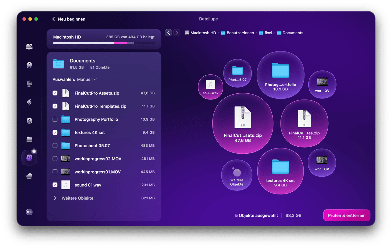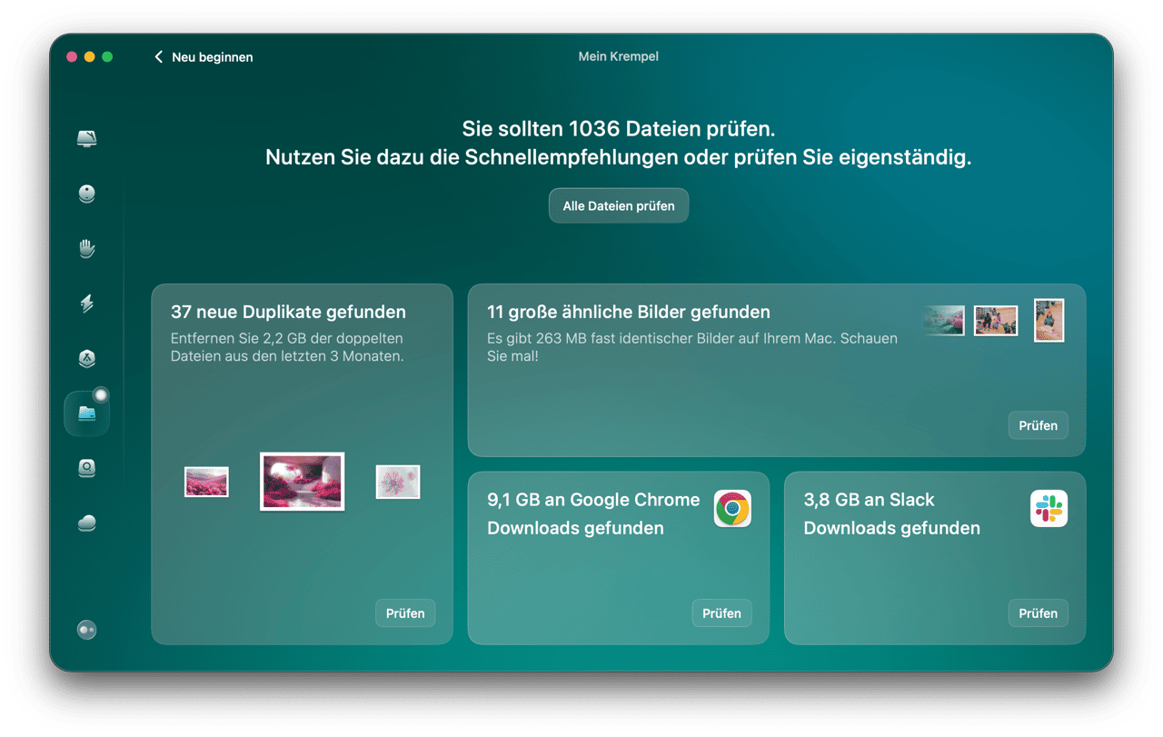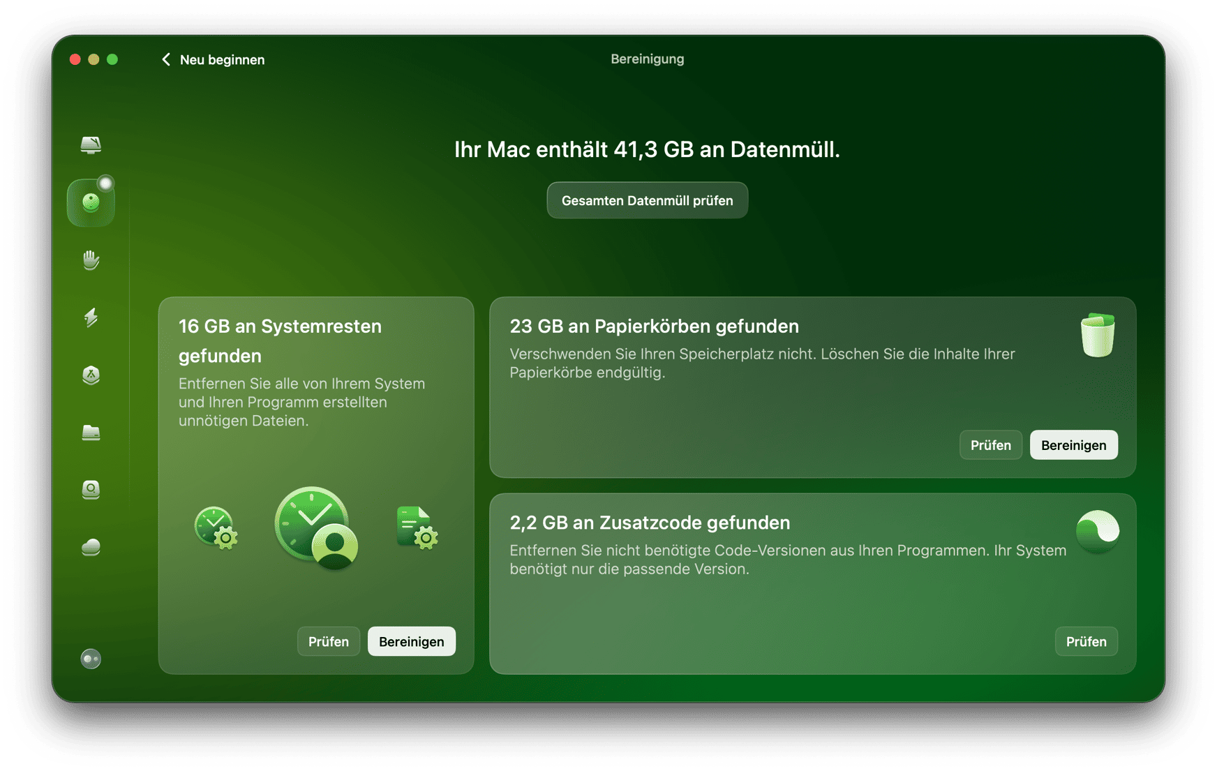 Beseitigen Sie den größten Teil nicht benötigter Systemdateien, versteckten Datenmülls, fehlerhafter Downloads und 20 weiterer Arten von Datenmüll. Holen Sie sich den zusätzlichen Platz für die wichtigen Dinge.