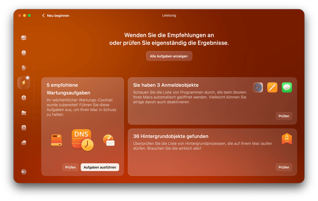 Wir empfehlen Ihnen, mit einem Smart Care-Scan zu beginnen. Er führt 5 Kernaktionen durch, mit denen Sie Probleme wie Datenmülllansammlungen oder Malware-Gefahren mit einem Klick lösen können. Sie können weitere separate Module nutzen, um verschiedene Mac-Optimierungsaufgaben nach Ihren Bedürfnissen auszuführen.