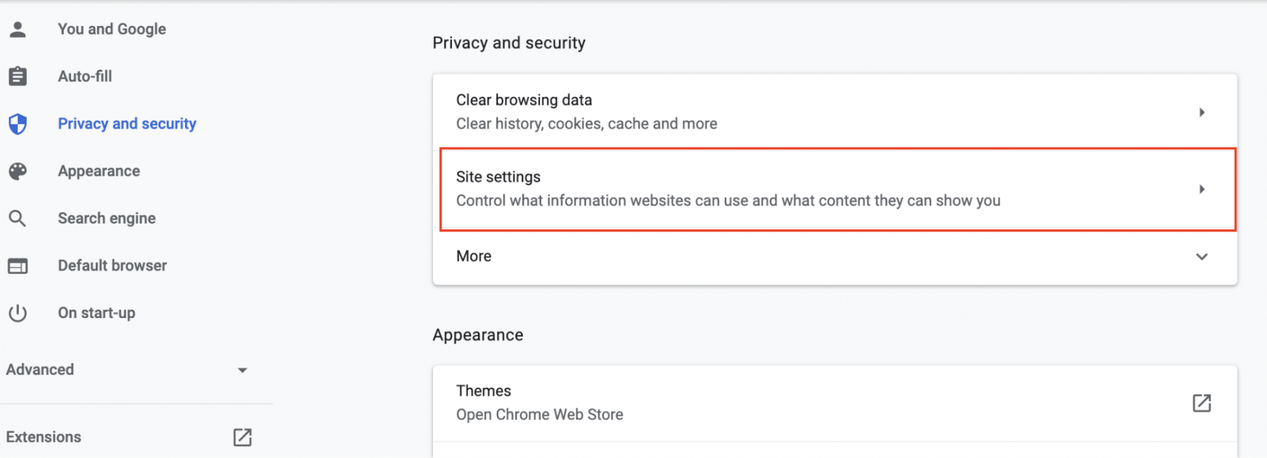- Click “Privacy and security” and select Site Settings.