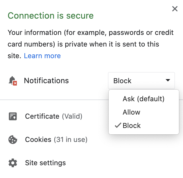 - Choose Block from the drop-down list to disable notifications for this site.
