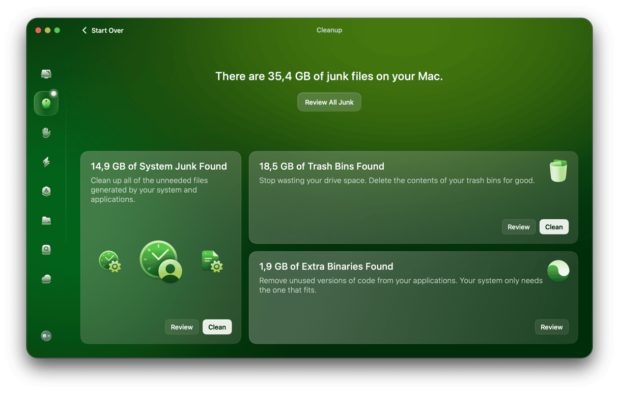 - Click Cleanup > Scan > Clean. If you want to select which files to delete, click Review All Junk first.