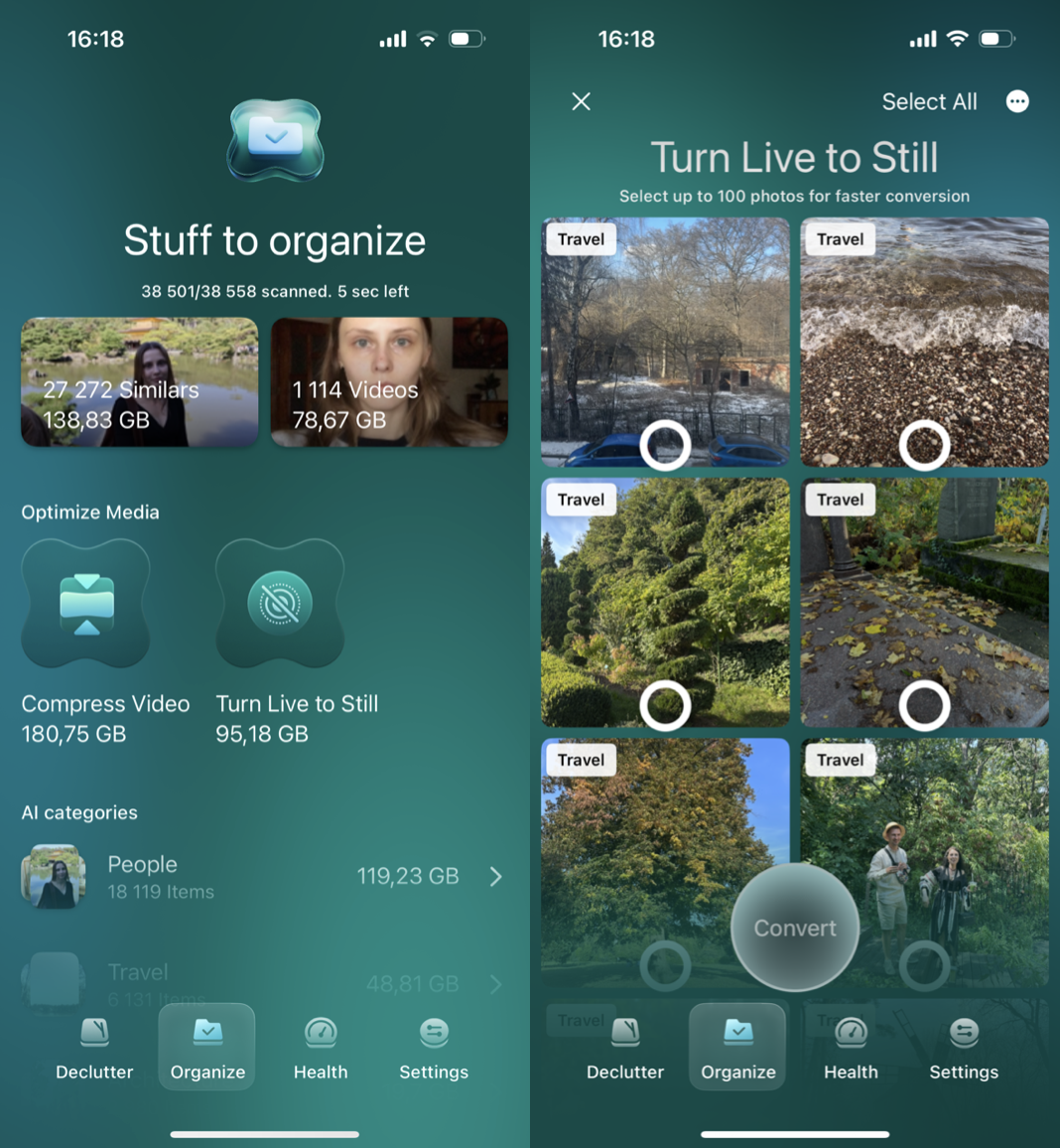 So you've decluttered your media; it's now time to delete similar photos or getting space back without deleting a thing. With CleanMy®Phone you can compress videos you don't want to get rid of and you can convert Live Photos to regular images.