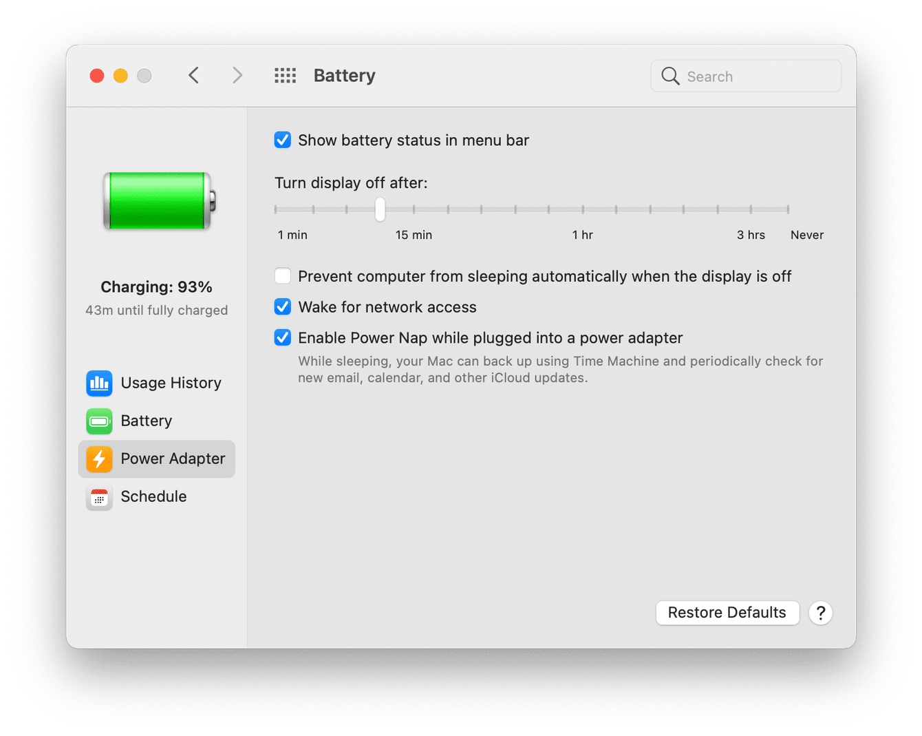Here you can manage the settings for when your MacBook is plugged in. The ‘Wake for network access’ option may need some explanation: having this setting enabled means, even when your Mac is in sleep mode, it will essentially wake up to give permission to shared resources, like Music playlists or printers.