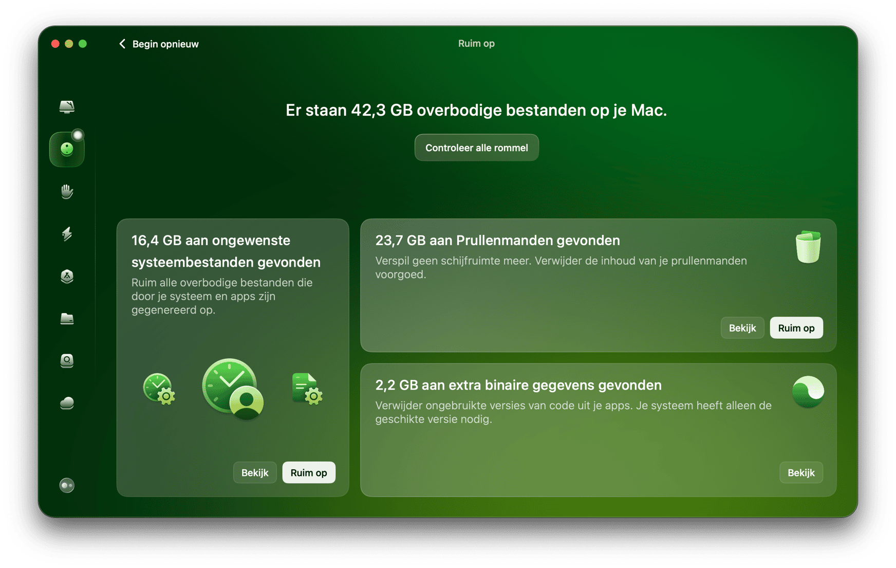 Raak eindelijk af van de grootste hoeveelheid overbodige systeembestanden, verborgen rommel, mislukte downloads en 20 andere soorten rommel. Krijg extra ruimte voor de dingen die er écht toe doen.