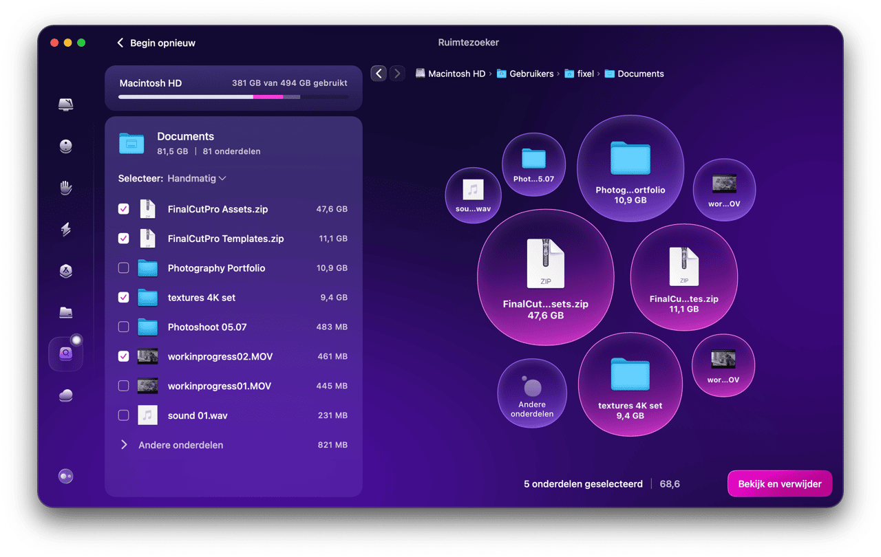 Maak een interactieve kaart van je volledige schijf en bekijk mappen gesorteerd op grootte. Laat Ruimtezoeker de grootste rommelbestanden vinden om die vervolgens eenvoudig op te ruimen.