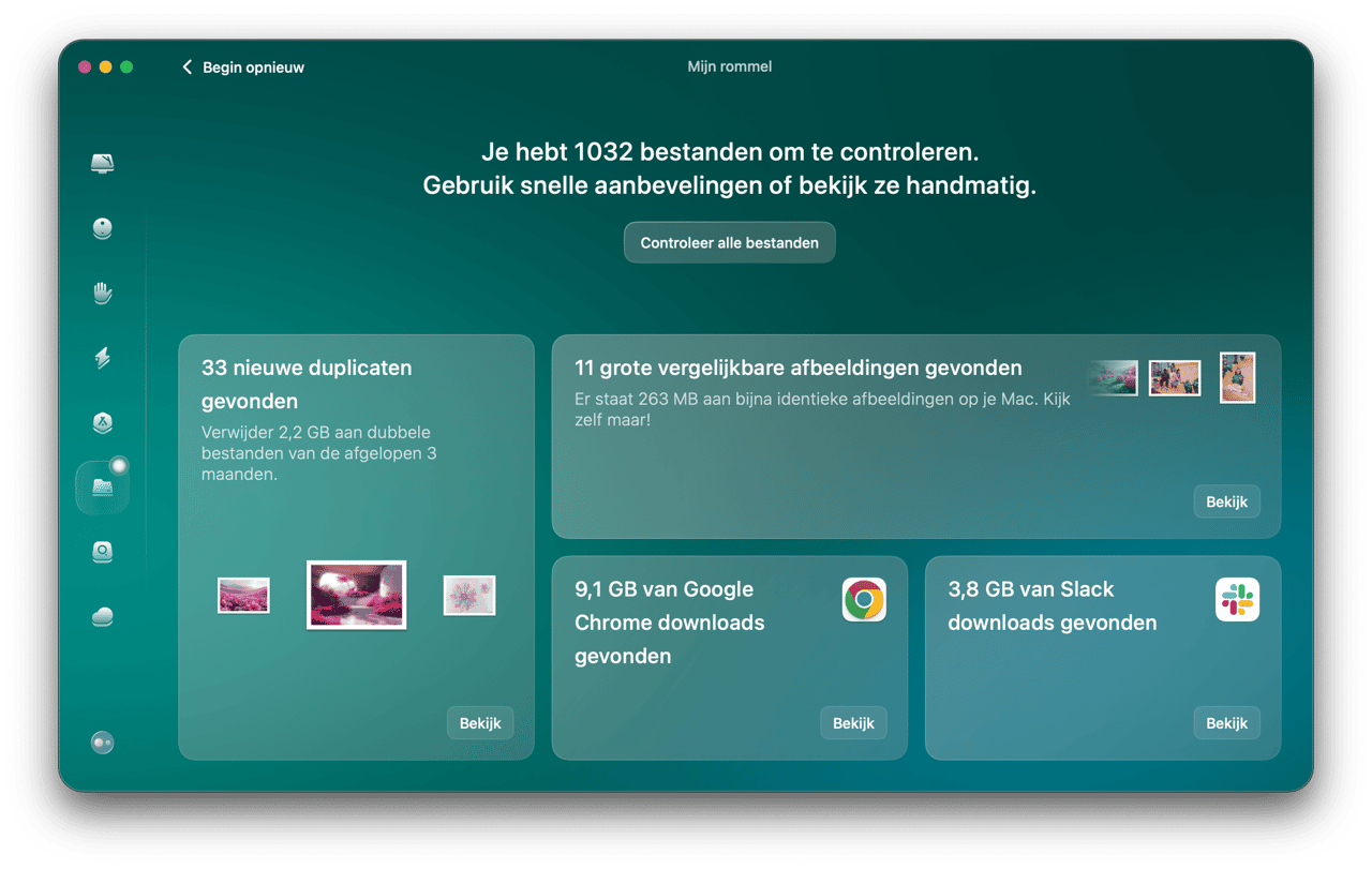 Verwijder duplicaten die kostbare ruimte innemen. Detecteer grote hoeveelheden aan gelijksoortige afbeeldingen en sorteer gedownloade bestanden om je Mac in topvorm te houden.