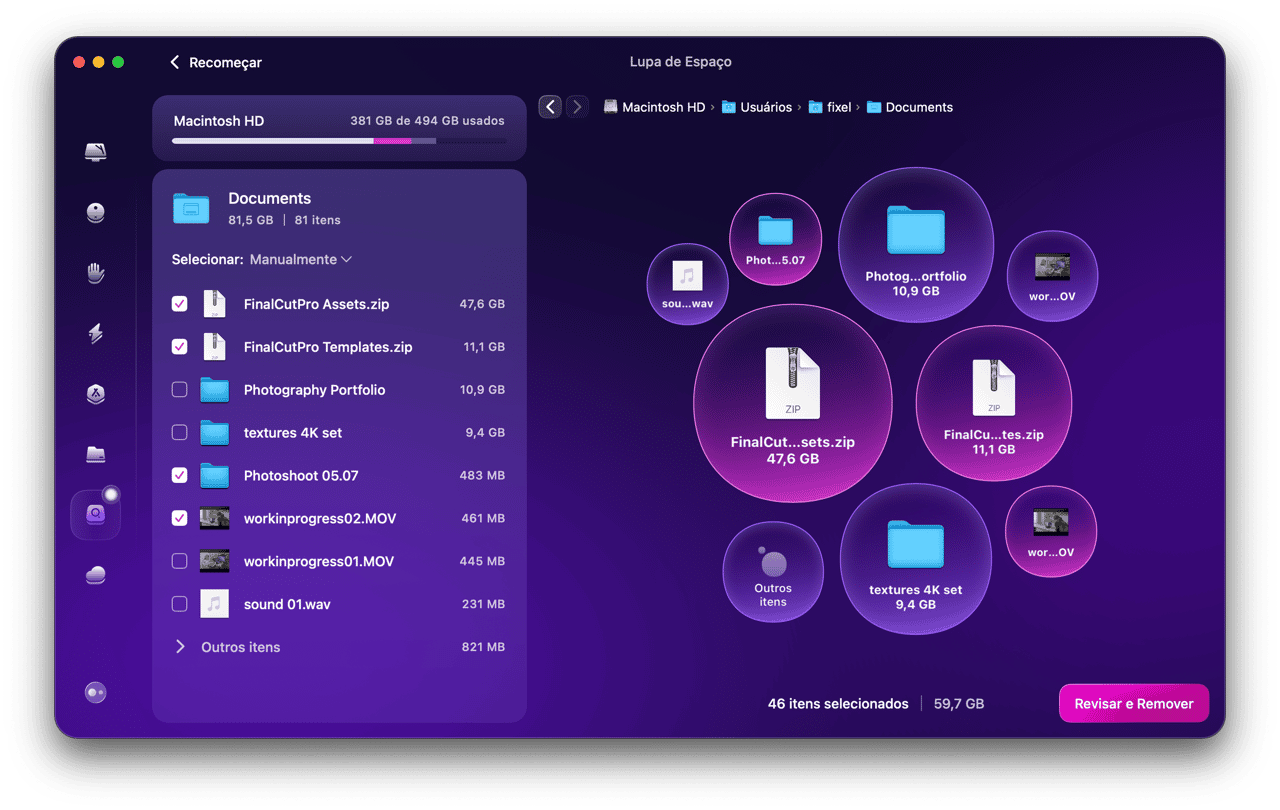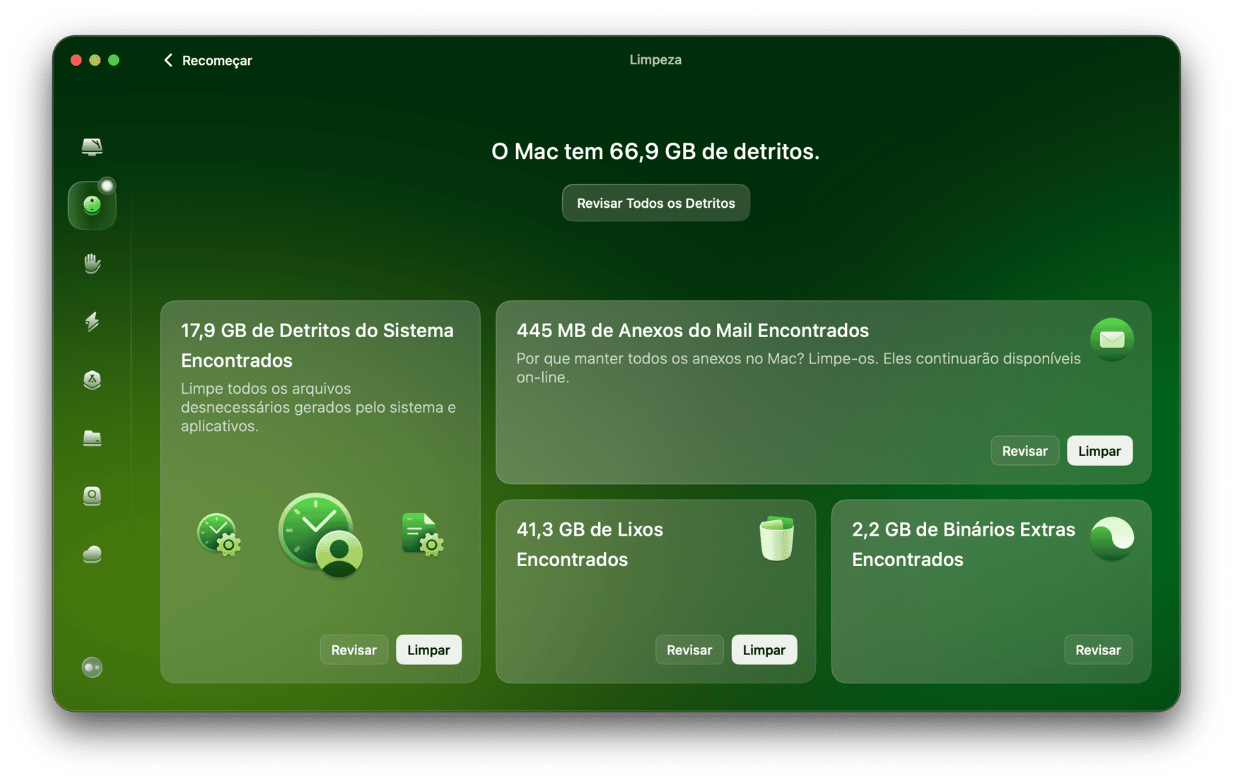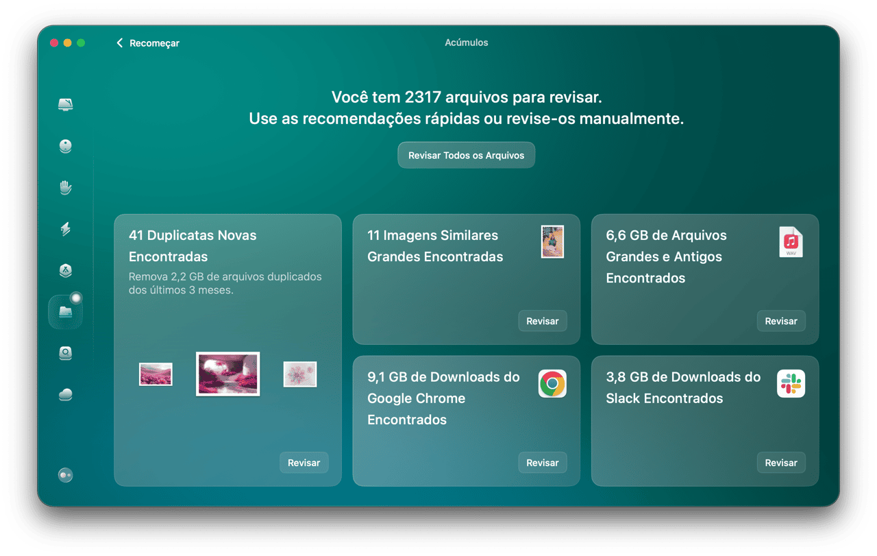 Elimine a maior parte dos arquivos desnecessários do sistema, acúmulos ocultos, downloads incompletos e outros 20 tipos de detritos. Tenha espaço extra para o que importa.