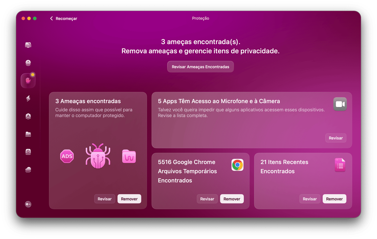 A ferramenta mais simples para manter seu Mac funcionando perfeitamente. Libere um monte de espaço, bloqueie malware e dê adeus a travamentos. Deixe o seu Mac pronto para qualquer desafio com o CleanMyMac.