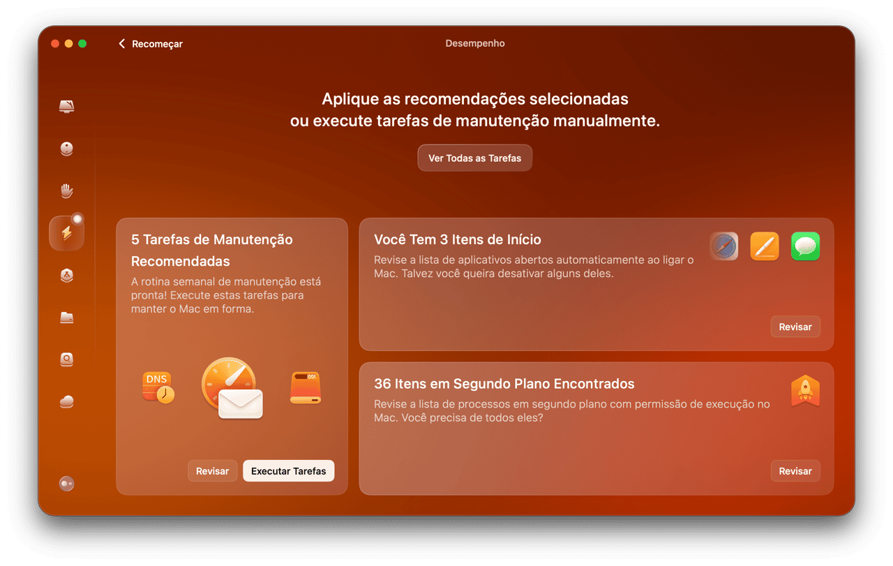 Recomendamos que você comece com a análise de Cuidados Inteligentes, que realiza 5 ações principais e permite lidar com problemas de acúmulo de detritos ou ameaças de malware com um clique. Fique à vontade para explorar os outros módulos e executar diversas tarefas de manutenção do Mac de acordo com as suas necessidades.