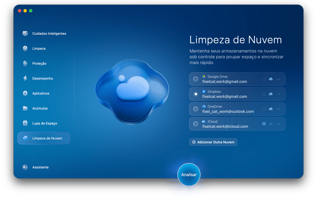 Você paga por armazenamento na nuvem que mal usa? Com a Limpeza de Nuvem, você vê o que está ocupando espaço nas suas contas de nuvem e libera espaço com apenas alguns cliques.