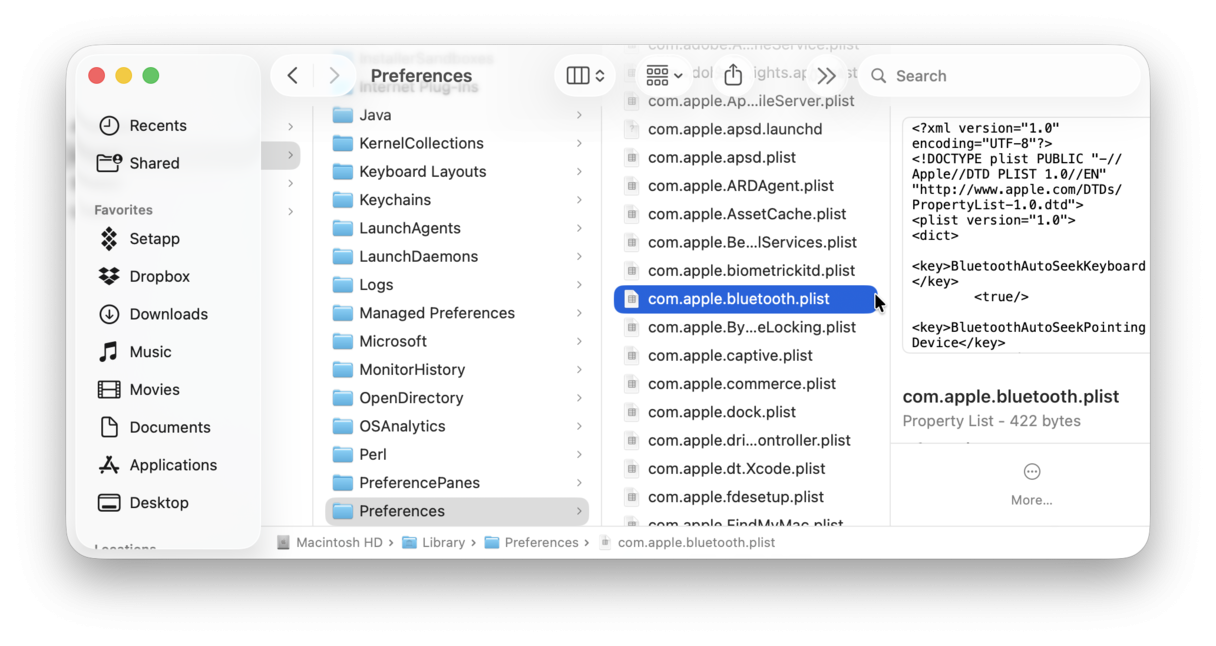 - Search for a file called com.apple.Bluetooth.plist — once you locate it, delete it.