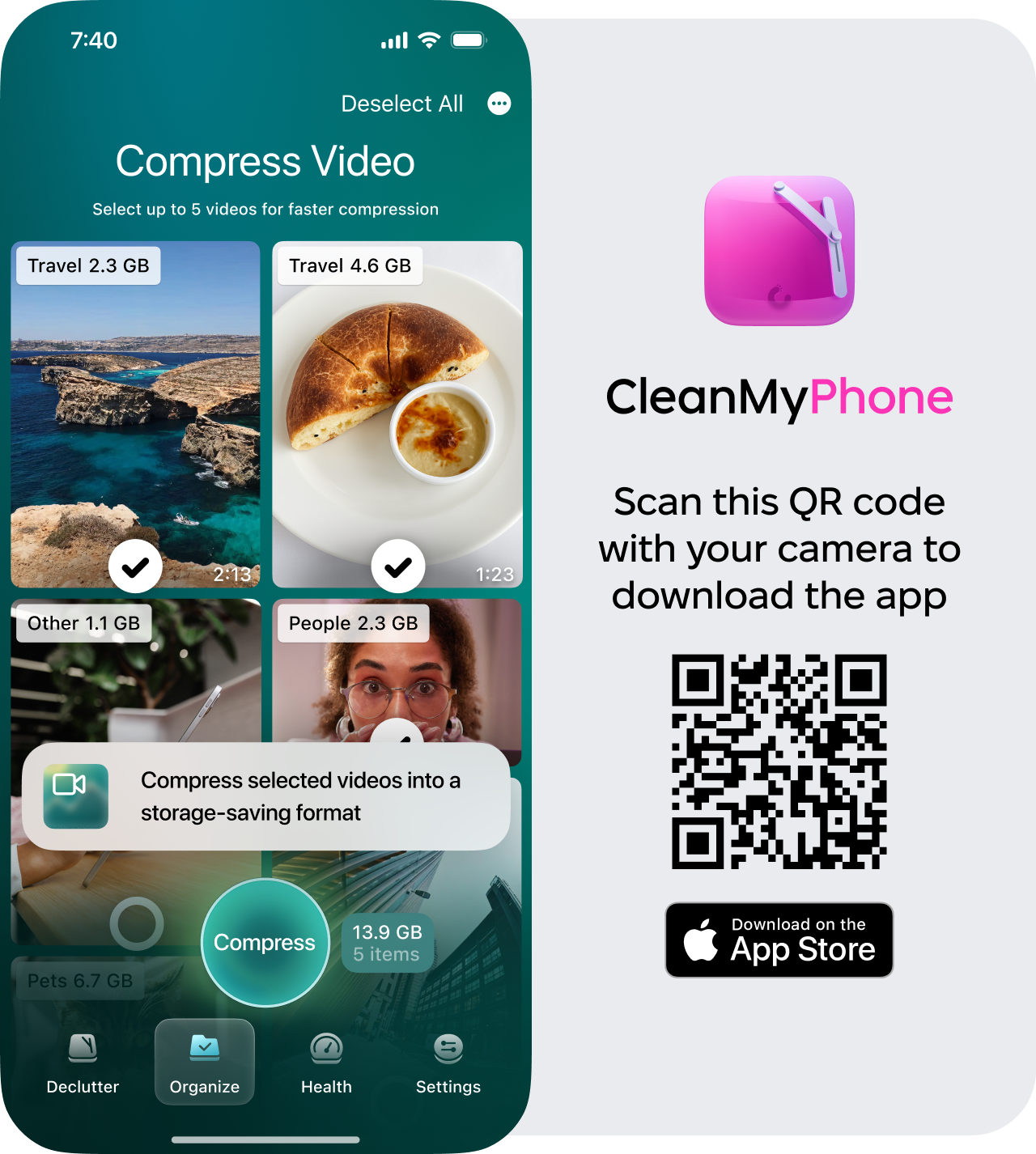 While resizing photos is pretty limited natively, videos often take up far more space than images. That's where I've found CleanMy®Phone's Compress Videos feature genuinely useful; here's how I use it:
