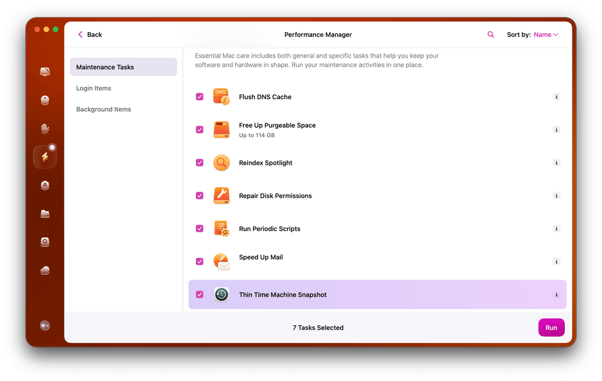 Maintenance tasks are helpful under-the-hood optimizations that your macOS runs to clean itself. This procedure rotates certain libraries and system logs and replaces old file paths — hundreds of small operations to shake up and refresh the system.