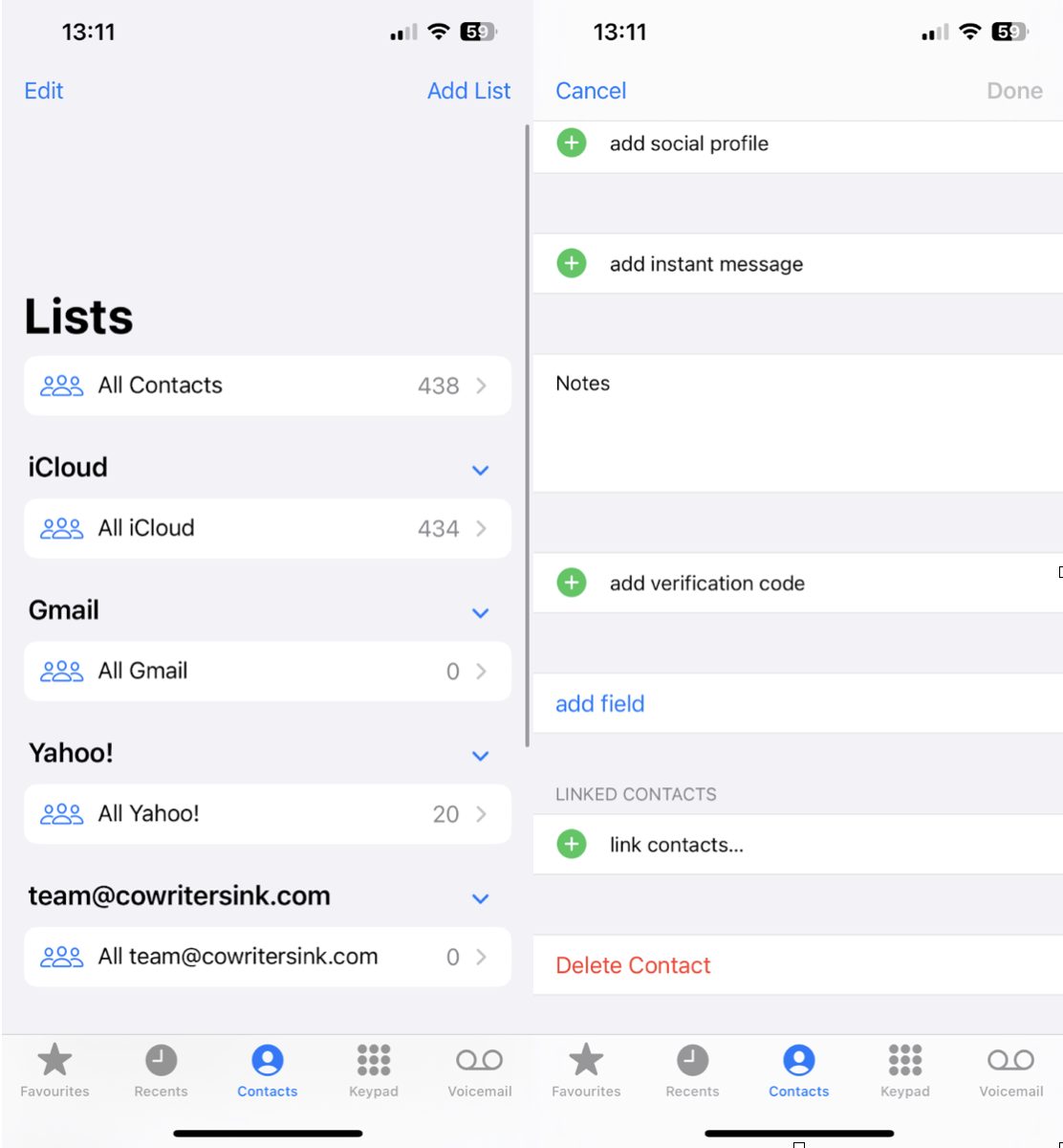 Multiple accounts: iCloud + Google + Microsoft Exchange all syncing Contacts at once.